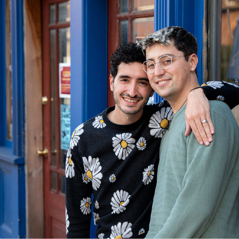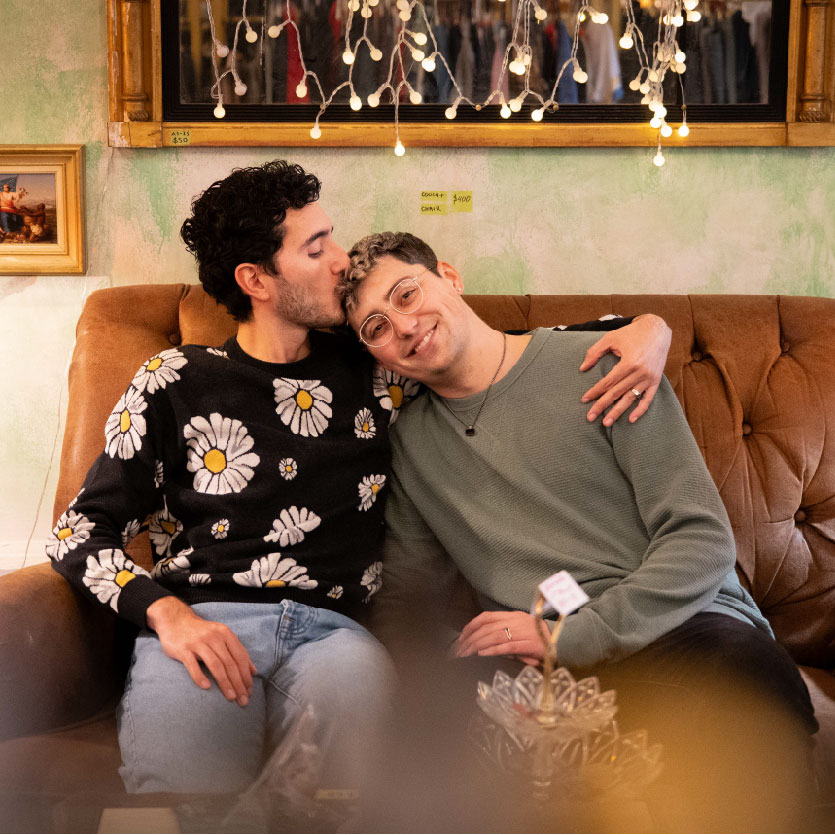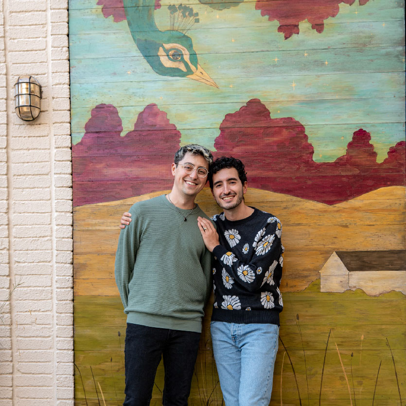 In September of 2022, Darius and Tom moved in together to an apartment on Mass. Ave. near Central Square in Cambridge. Over the years they’ve enjoyed curating their decor, growing their record collection, cooking dinners together, sitting out on their balcony, and hosting their annual Pride Brunch.